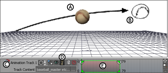 Keyframe animation A. Baseball model in the Viewer window. B. A static storyboard panel used as a template. C. Animation track for a baseball. D. The track’s Animate button is active. E. Animation clip which consists of keyframes.