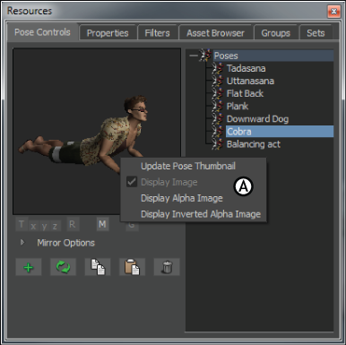 The pose thumbnail allows you to see a snapshot of the pose which is captured at the time the pose is created. To judge the aesthetic of a pose, right-click the thumbnail to choose either an alpha or an inverted alpha silhouette.