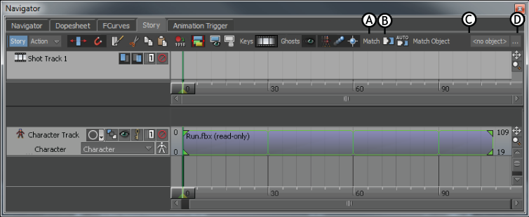 Match Controls in the Story window A. Match Options button B. Auto Match option C. Match Object field D. Match Object button
