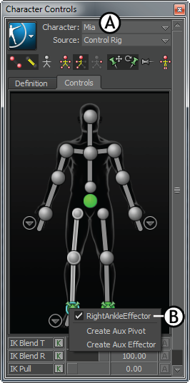 Character Controls window A. Select your Character in the Character drop-down list B. Right-click an effector to select it