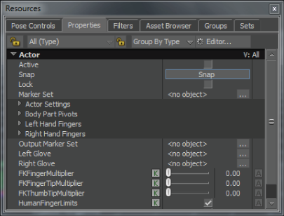 The Mapping option in the Source drop-down list activates and snaps the Actor to its Marker set. This option is the same as the Active option in the Actor settings.