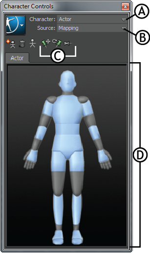 Actor Controls window A. Character drop-down list B. Source drop-down list C. Effector pinning buttons D. Actor representation