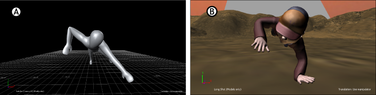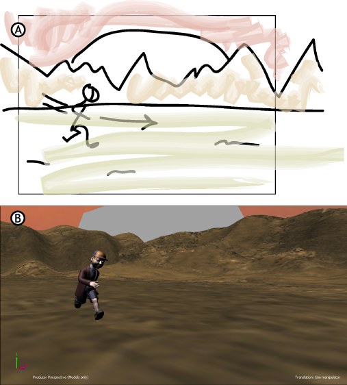 A. Storyboard using models and animation B. Final scene using the storyboard