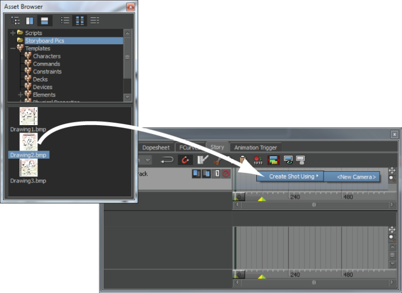 - Drag an image to use for a storyboard from the Scene or Asset browser into the Story window Edit track.