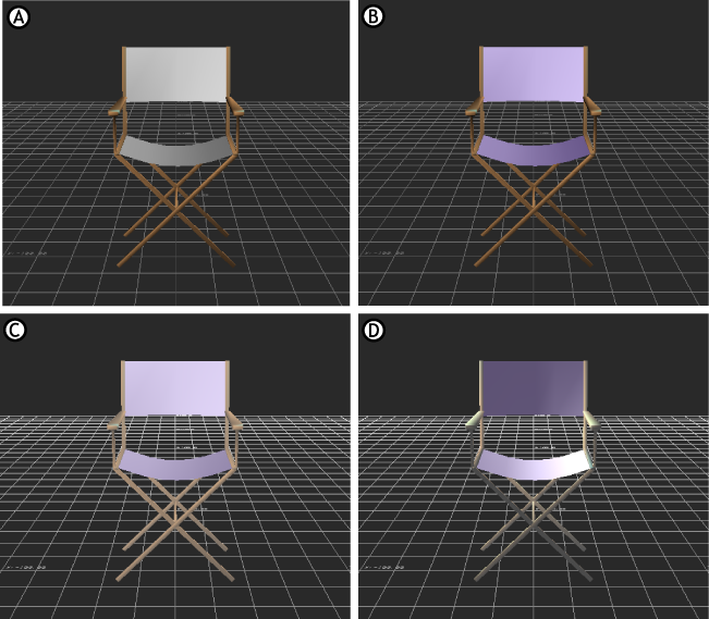 Global lighting examples A. Global lighting B. Ambient color changed C. Ambient color changed and Fog added D. Ambient color changed, fog added, two custom lights added