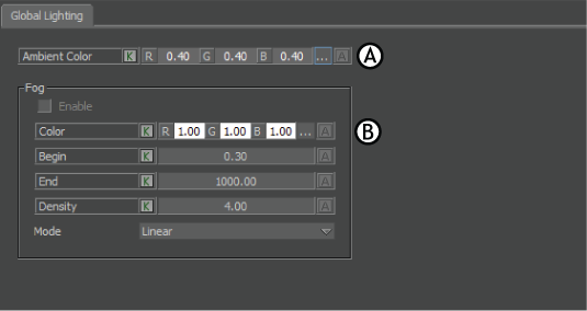Global Light settings A. Ambient Color settings B. Fog settings