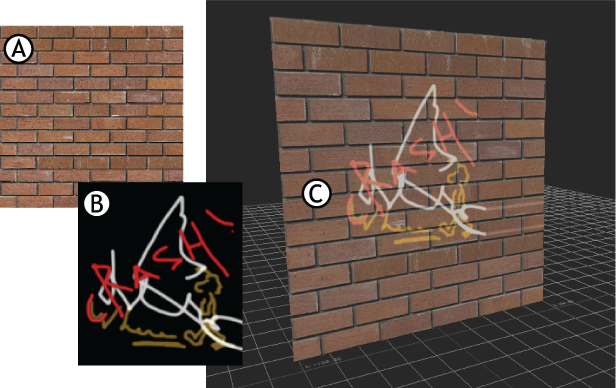 Blending textures A. Tiling brick texture B. Graffiti texture with alpha channel C. Both textures combined on one model using a Layered texture