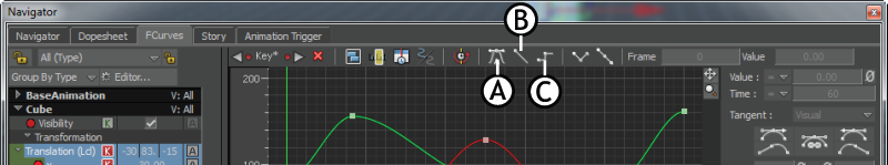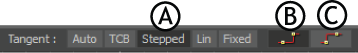 Tangent options A. Stepped option is active B. Set Keys to Constant Normal option C. Set Keys to Constant Next option