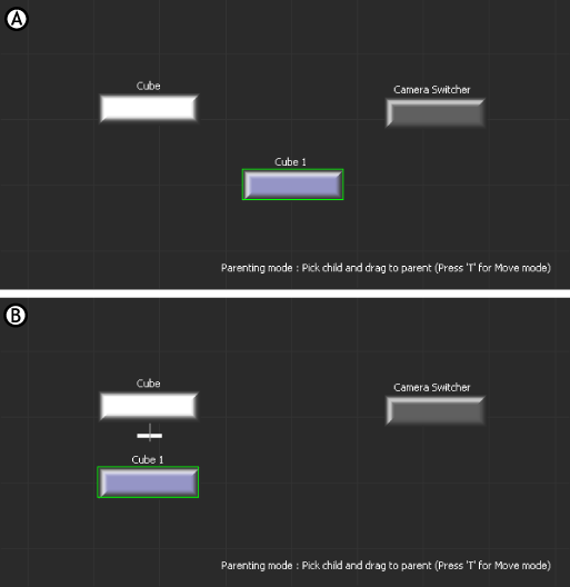 For example, the following figure illustrates two cubes before and after parenting in the Schematic view.