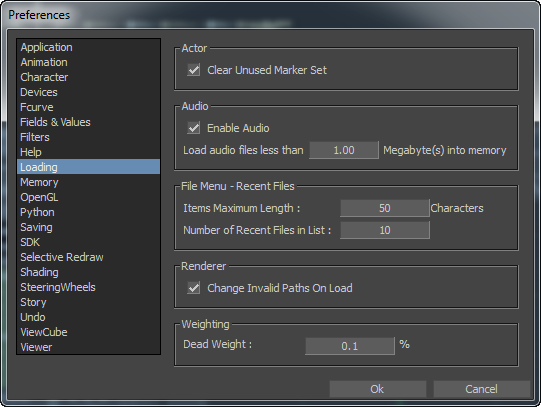 The File Menu - Recent Files preference settings let you set defaults relating to files recently loaded in MotionBuilder. The following table describes the File Menu preference settings.