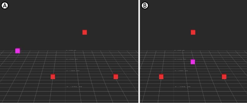 For example, in following figure, A, a constrained object to the left of three objects in a triangle formation is shown. When the constraint is activated, the constrained object moves to become equidistant from the three source objects to B.