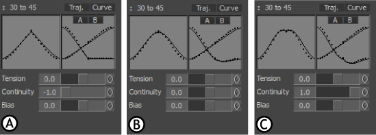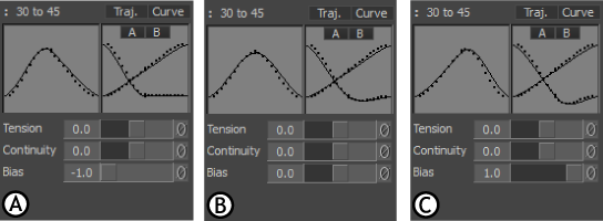 The Bias settings let you change the angle of the trajectories and curves in the animation, making them lean left or right. For example, when Bias is set to a value of -1, the result is similar to using the Discontinuity Right button on a selected keyframe with Auto interpolation.