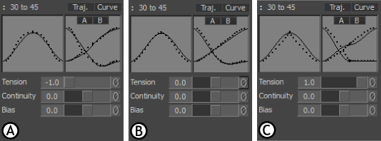 When you select TCB in the Interpolation Mode menu, Tension, Continuity, and Bias settings appear in the settings area. Each of the settings changes a different part of the tangent.