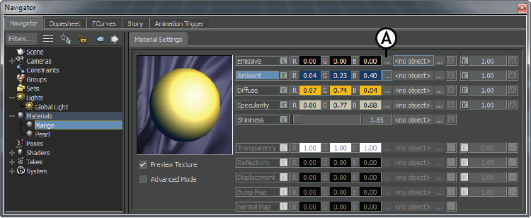 For example, you can open the Color window from the Emissive, Ambient, Diffuse, or Specularity color areas of the Material settings pane by clicking the Color (...) button.