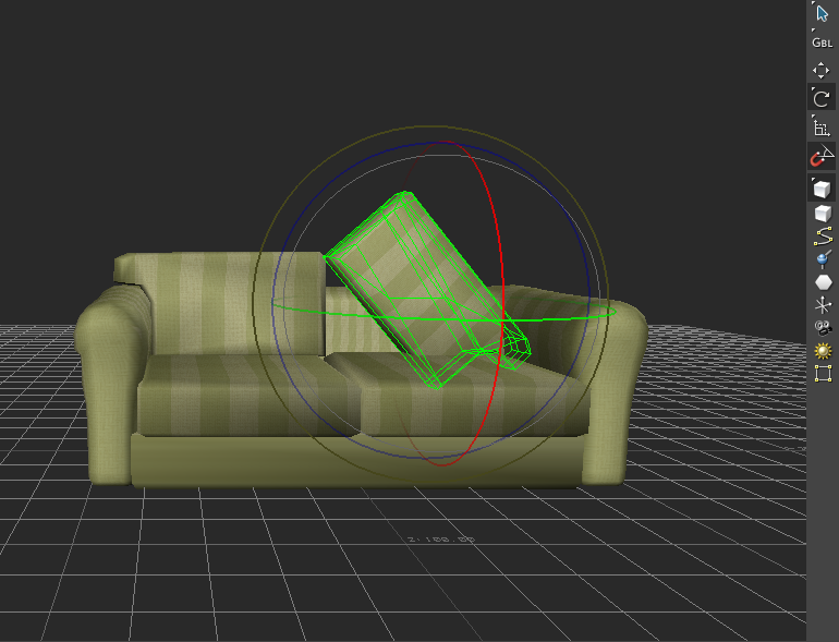 Selected object in the Viewer window displays with Rotation rings for rotating on the X, Y, or Z axis