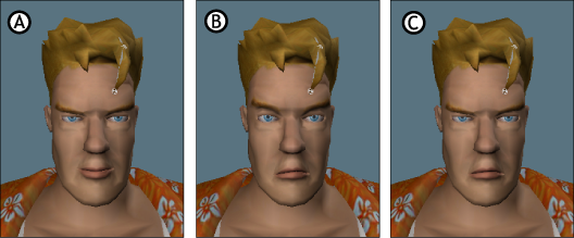 For example, you can blend the “Brow Down” shapes with the “Mouth Corner Down” shapes to create an angry facial expression on the model, as shown in the following figure.