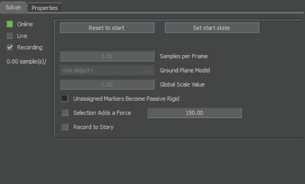 | Online | Activates physics solving. In the Navigator > Properties window, the Online option is referred to as Active. Note: You cannot add Physical properties (for example Rigid Body, Ragdoll or Joint) to objects while the Physics Solver is online.