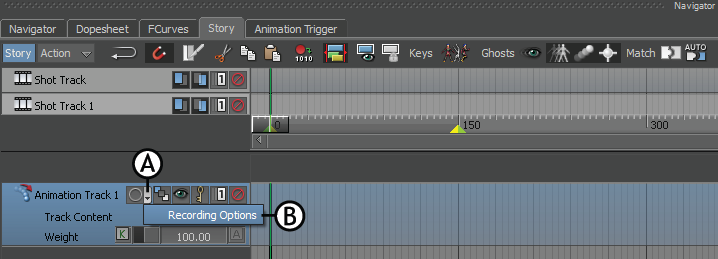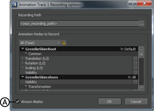 Animation Track Recording options window A. Always display checkbox turned on by default