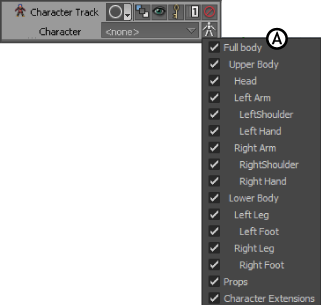 Use the Body Parts menu to select the parts of the character that are to be used in the animation. Use the menu to also select or deselect any character extensions or props included as track content.