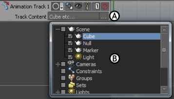 The Track Content list displays the name of the asset that you drag onto an Animation, Character, or Camera Animation track. A track’s clips affect the asset selected in the Track Content list. These selected assets are often referred to as the track content.
