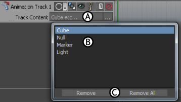 Animation track A. Track Content list B. Click on the list to see what you dragged into the track. C. Remove button