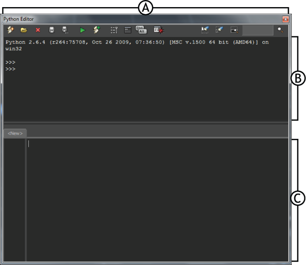 The Python Editor tool consists of the following areas: the toolbar, the interactive console, and the work area.