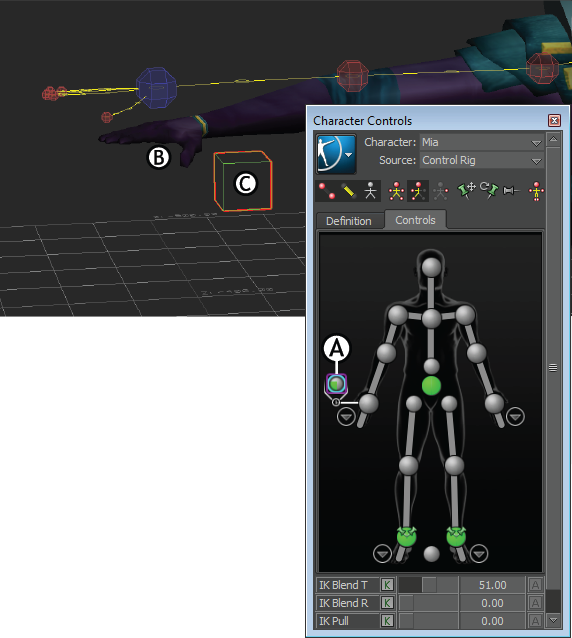 Adjusting Auxiliary reach A. Right wrist effector Auxiliary effector selected B. Hand reaches between IK effector and Auxiliary effector C. Auxiliary effector is translated away from right wrist