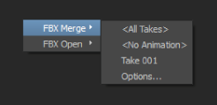 | Take 001 | This part of the context menu lists the takes in the .fbx file. Selecting the take name merges only keyframe animation on assets and models associated with the selected take. |