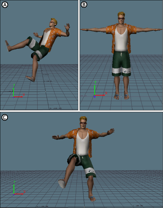 Pasting with the Rotation (R) option active A. In the pose to be pasted, the selected Hips effector is oriented at an angle from the camera B. The character the pose is pasted on faces the camera C. The pose is pasted and the character assumes pose A, but keeps its original orientation, facing the camera