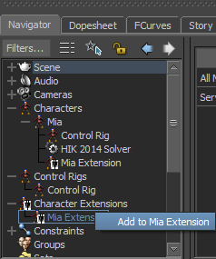 The Mia (Character) Extension is displayed under the Characters branch and the Character Extensions branch.