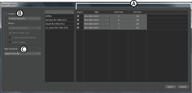| Take column | Displays the name of the take where each animation is imported. If you import to a take that already has animation, it is replaced by the take you are importing. If you want to import to a new take, select New Take from the list of takes. You can also rename the take using this field. |
