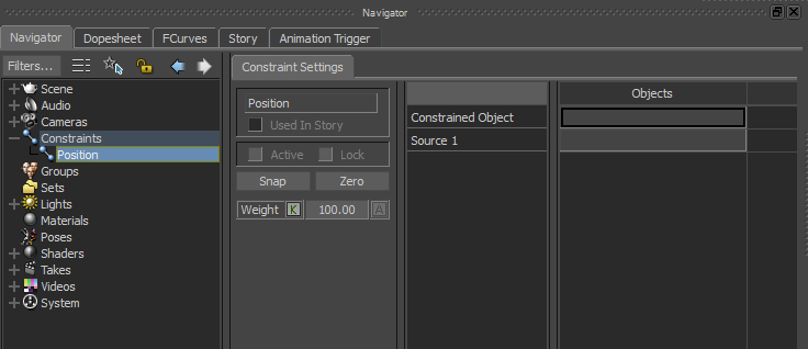 - Assign the object that you want to position and translate in the scene based on the position and movement of one or multiple source objects to the Constrained (child) object cell.