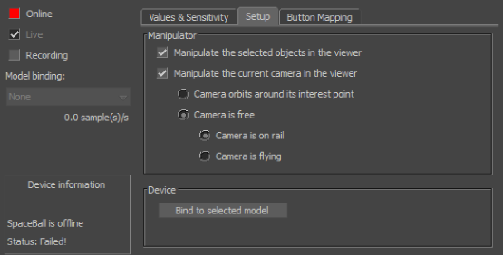 | Manipulate the selected objects in the Viewer window | Lets you manipulate selected objects with the SpaceBall device. To manipulate objects, make sure the device is Online, activate this option, select an object, then move the SpaceBall device. Make sure there are no constraints connected to this object. |