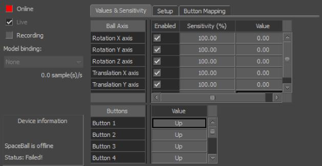 SpaceBall device settings, Values & Sensitivity pane