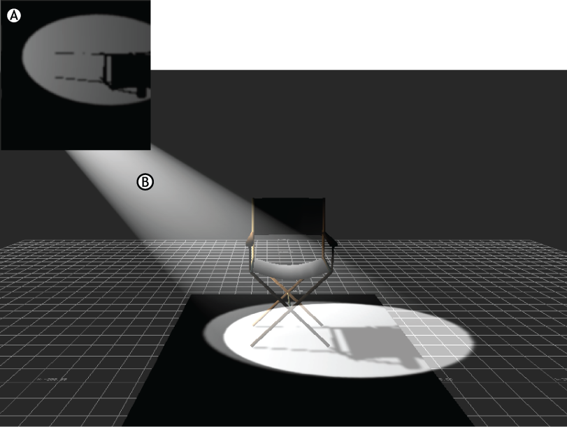 Map examples A. Created map B. Scene with the shadow map applied to the floor plane.