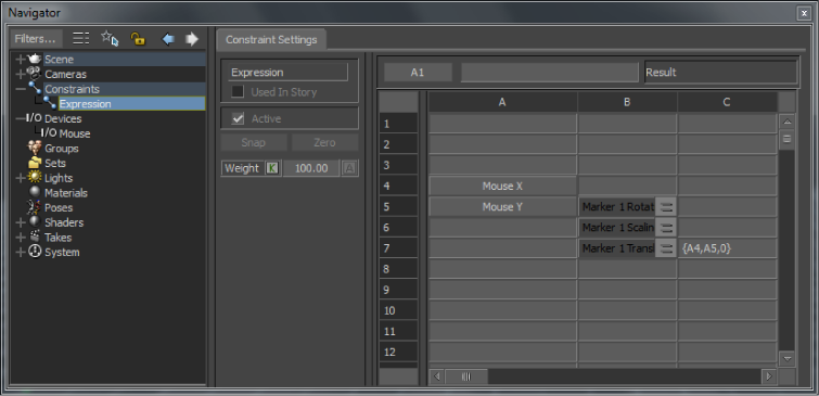 In MotionBuilder, expressions are referred to as expression constraints. Unlike Relation constraints, you use a spreadsheet-style interface to construct expression constraints. This spreadsheet interface is called the Expression Constraint Settings pane.