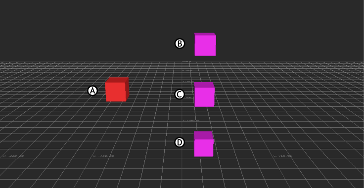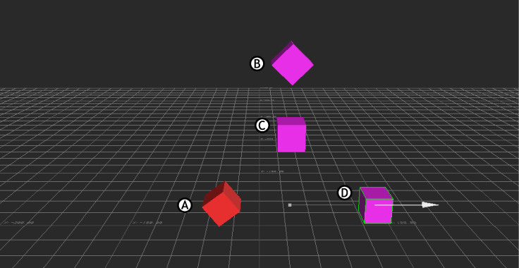 Rigid Body constraint with three source objects. Before activation, the constrained object (A) does not move B, C, and D.