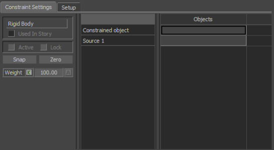 When you drag an object into the Source 1 cell, another source is added to the Objects pane. If you drag a second source into Source 2, the position and rotation of the constrained object is derived from the position of the two source objects.