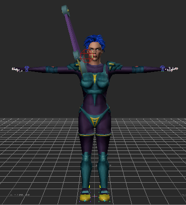 In the Viewer window, Mia with her servo arm appears in the T-stance.