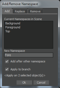 The Add/Remove Namespace dialog box appears, displaying in numeric alpha order the namespaces in the scene.