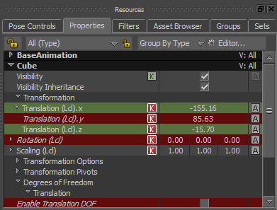 You can lock properties or channels to prevent any changes from happening on the selected property or channel. This is useful for Technical Directors and animators who need to prevent body parts from receiving keys. For example, if there is more than one animator working on a character rig and the Technical Director does not want animation to be created to parts of the character, one way of achieving this is to lock or mute properties and channels.