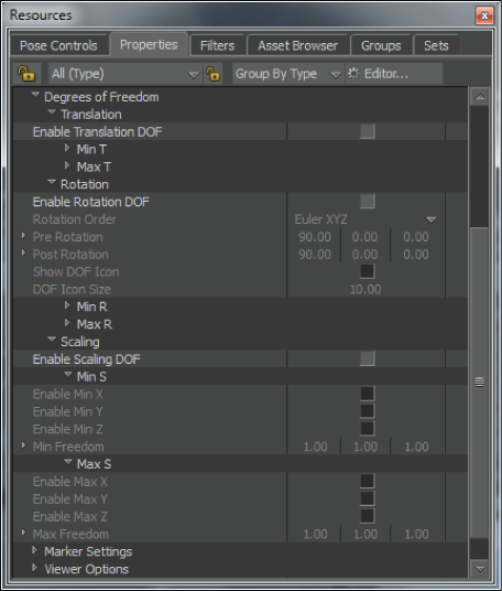 Degrees of Freedom for translation let you define the coordinates an object is allowed to occupy on the X-, Y-, and Z-axes. For rotation, Degrees of Freedom properties let you define the angles an object can rotate through on the X-, Y-, and Z- axes. Degrees of Freedom properties for scaling let you limit the size of the selected object.