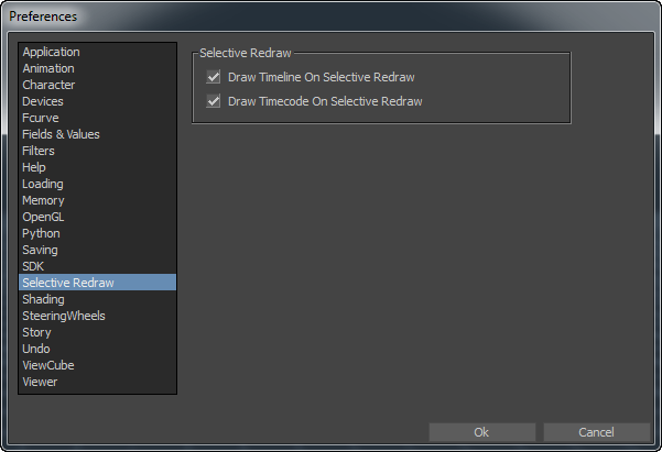 The Draw Timeline On Selective Redraw option lets you specify whether the Timeline is updated. Activate this option to update the timeline. Disable it to achieve faster frame rates by skipping the automatic Timeline update. This option is active by default.