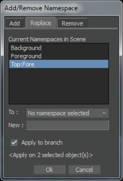The namespace for the selected object is replaced with the name specified in the Add/Remove Namespace “New” field.