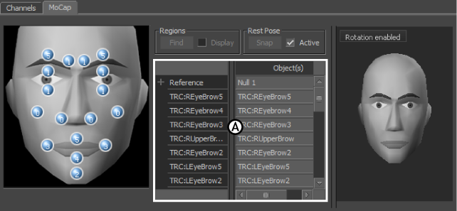 The MoCap pane lets you map markers to drive the Actor Face. The markers can be, for example, a set of optical markers imported from a Vicon .c3d file, or a set of sensors connected to a live device.