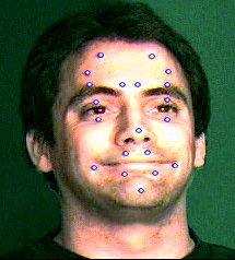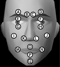 A. Right outer eyebrow B. Right inner eyebrow C. Left inner eyebrow D. Left outer eyebrow E. Right upper eye F. Left upper eye G. Right lower eye H.Left lower eye I. Right cheek J. Left cheek K. Right nostril L. Left nostril M. Right mouth N. Left mouth O. Upper mouth P. Lower mouth Q. Chin