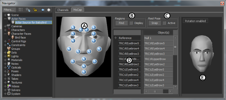 MoCap pane A. Mapping model B. Regions area C. Rest Pose area D. Marker Set list E. Mocap Preview area