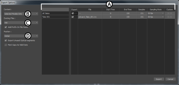 Export Options dialog box with two takes A. Export Table B. Content area C. Existing Files area D. Additional Export Options