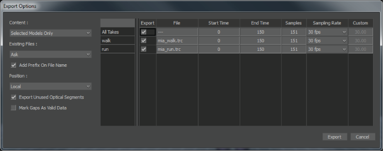 Click OK to export your scene using the selected scene format. The Export Options dialog box appears, letting you select which parts of the scene you want to export.