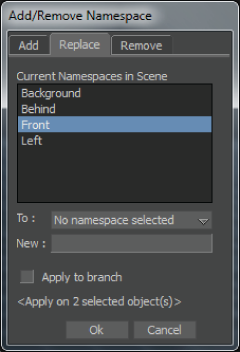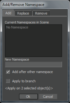 The Add/Remove Namespace dialog box appears displaying the namespaces in the current scene.